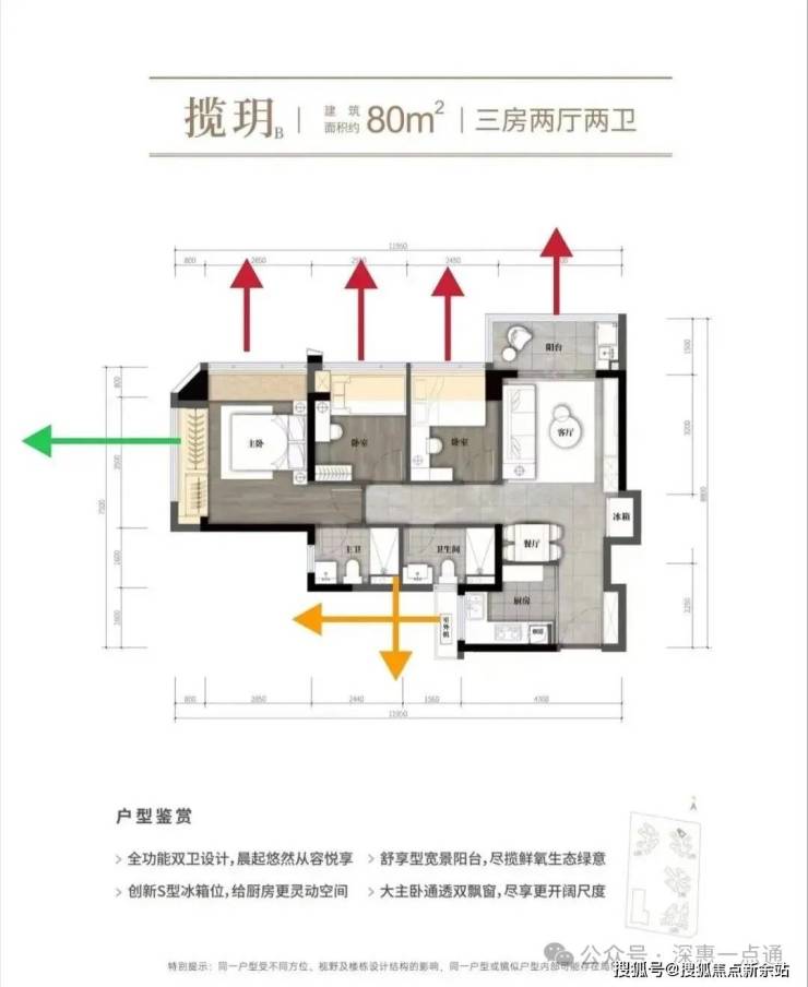 黄色箭头呢也是这里最需要注意的一点小次卧飘窗,客厅卫生间对出去是80平米的墙体还好不会对视就是遮挡问题,就是客厅飘窗有点尴尬对出去是80平米的两个卫生间