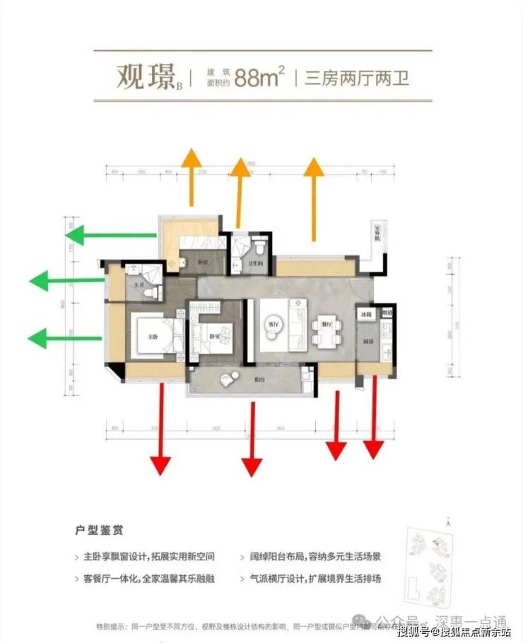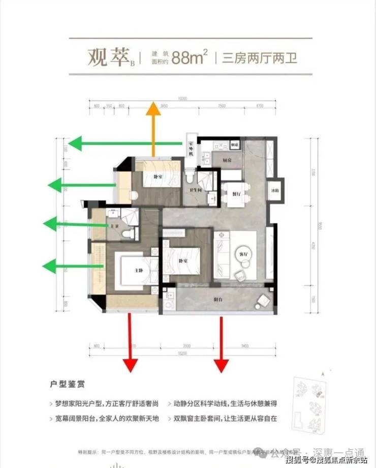 这里先分析一下02的88横厅情况,88横厅红色箭头阳台,次卧,主卧西南朝向其实也是跟106一样,会夹在中间,而且这个更严重,左侧被自己的107遮挡,右侧是1栋,相比106来说88横厅这里视野更差一些,这个户型唯一优势在于格局以及使用率会比竖厅的88好