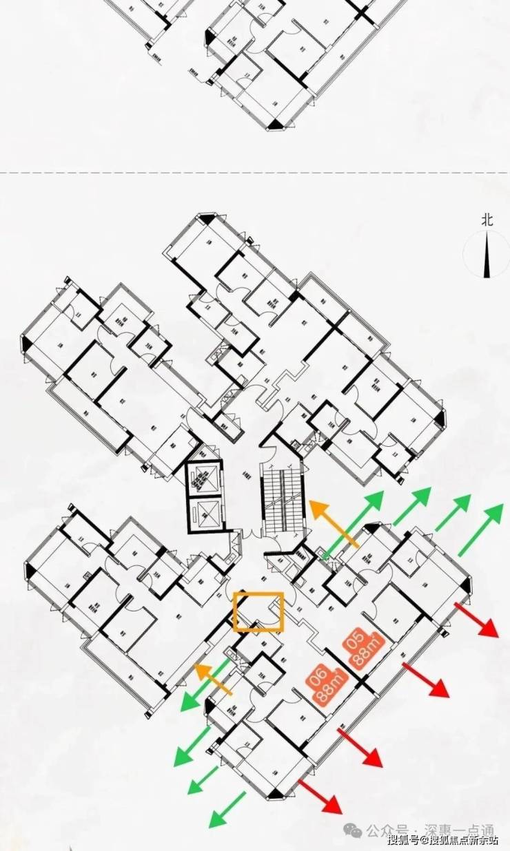 最后再来说一下黄色箭头情况这里是比较需要注意的点这里可以看一下这个楼栋平面图,其中书房次飘窗,客厅卫生间看出去是天井墙体,所以书房做了是双面采光这里还好,卫生间可能影响一点,客厅飘窗也会有跟06户型88平米的书房对视遮挡问题,这里后续可以通过其他问题解决