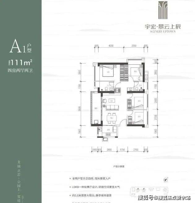 111㎡的4房2厅2卫:横厅南北通透格局,客餐厅5.6米开间,LDKB一体化,五开间朝南,得房率约76%(不含赠送),阳台主朝西南向。