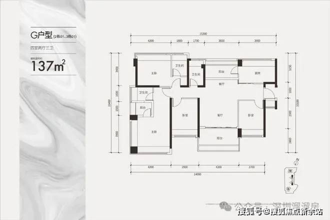 建面约137㎡双套间户型(四房三卫)