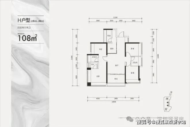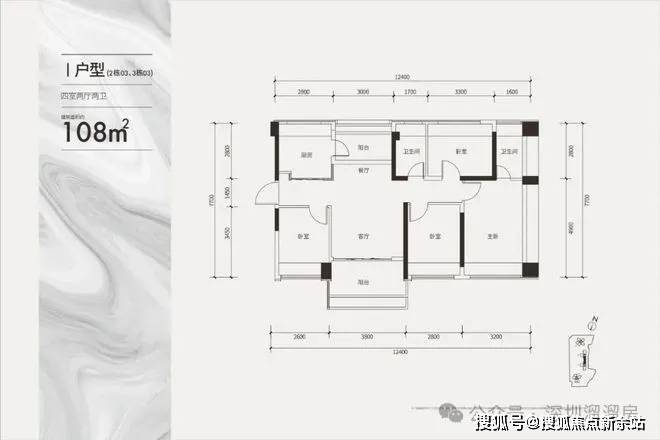 建面约108㎡通透四房户型