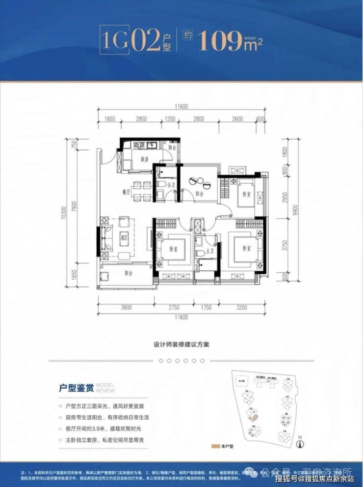 1G-02户型:约109㎡ 四房两厅两卫: