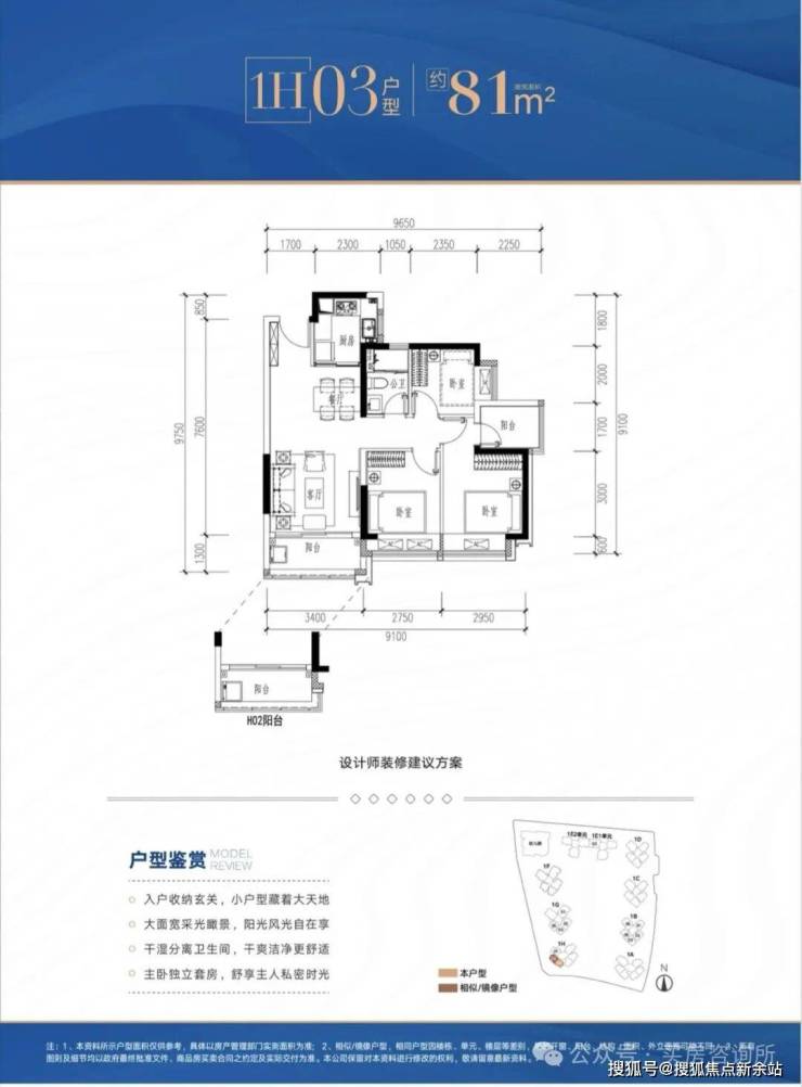 1H-02/03户型:约81㎡ 三房两厅两卫: