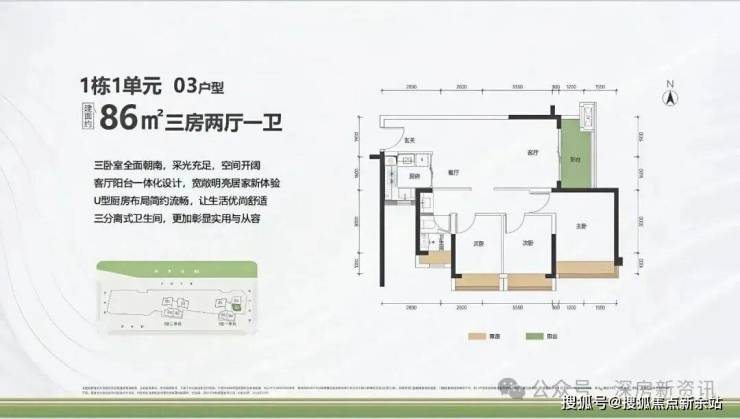 86㎡的3房2厅1卫,1栋1单元03户型,设计的是竖厅格局,客厅3.5米开间,进深9.95米,主卧全朝南,阳台1.5米进深,东南朝向。