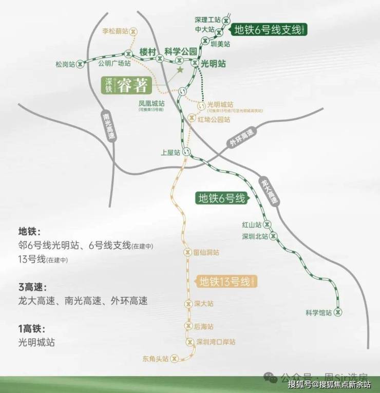 ★项目周边有6号地铁线3站点环绕,包括光明站(距离约1公里)、科学公园站(直线距离800米)和楼村站(距离约1.2公里)。其中,光明站可换乘6号支线,快速通达其他区域。