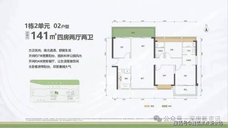 141㎡的4房2厅2卫,1栋2单元02户型,设计的是竖厅南北通透格局,客厅4米开间,四开间朝南,主卧套房带阳台,客厅连接次卧出7米长的巨幕大阳台,阳台主朝东北向看科学公园。深铁睿著广场售楼处电话✅:400-150-5057