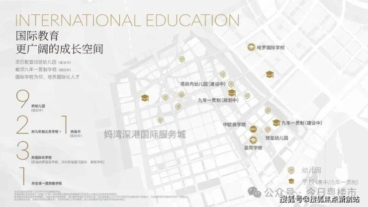 项目周边拥有15所幼儿园、4所义务教育学校,还有荔湾小学和深大附中等学校都在周边。此外项目靠近多所国际学校,拥有3000到5000个名额,包括荟同国际学校、礼德国际学校、英国国王学校(深圳分校)以及深圳哈罗国际学校。临近小区南侧有一块九年制教育用地,但目前未招标。入住早期可能要到妈湾南二外学校或者前湾南二外学校上学。