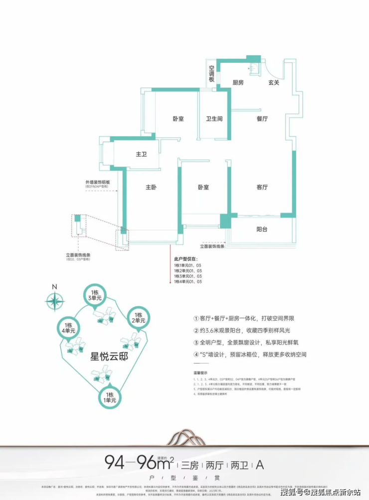 94㎡的3房2厅2卫,设计的经典竖厅格局,客厅3.6米开间,客餐厨一体化,S墙设计预留冰箱位,三开间朝南,U型厨房,得房率:78.15%(不含赠送),有西南及东南朝向。