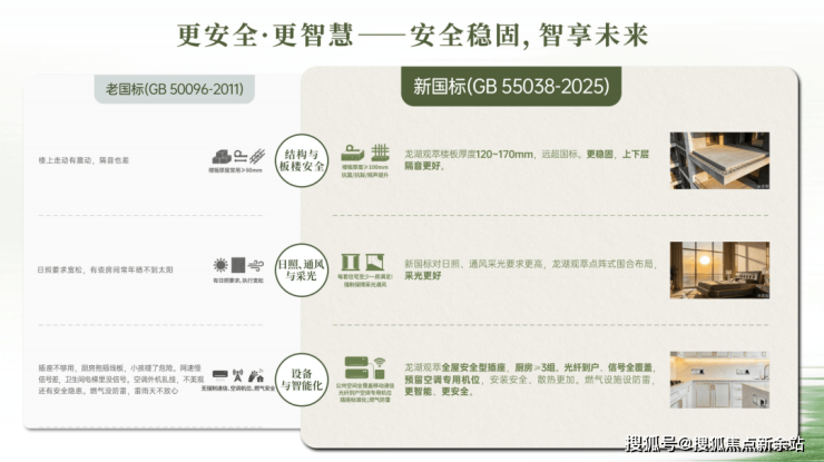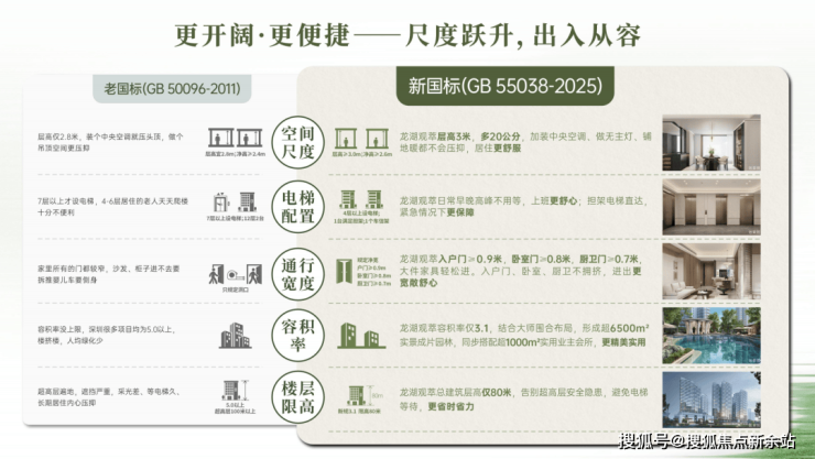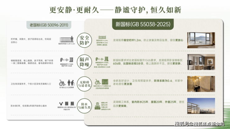 住宅国标3.0时代(2025年):定义“好不好”,国家首次以强制性规范为好房子立序——层高强制≥3米,住宅限高80米,容积率不超过3.1,楼板撞击声隔音提升10分贝,防水设计工作年限全面提高,适老化、信号全覆盖等14项硬性指标全面升级。
