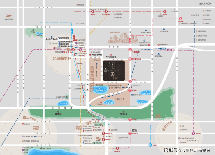 深圳“正”中心:深圳地理几何中心,受北站CBD,福田CBD双辐射,是深圳政治、经济、文化、商业、人文的核心版图与城市客厅。