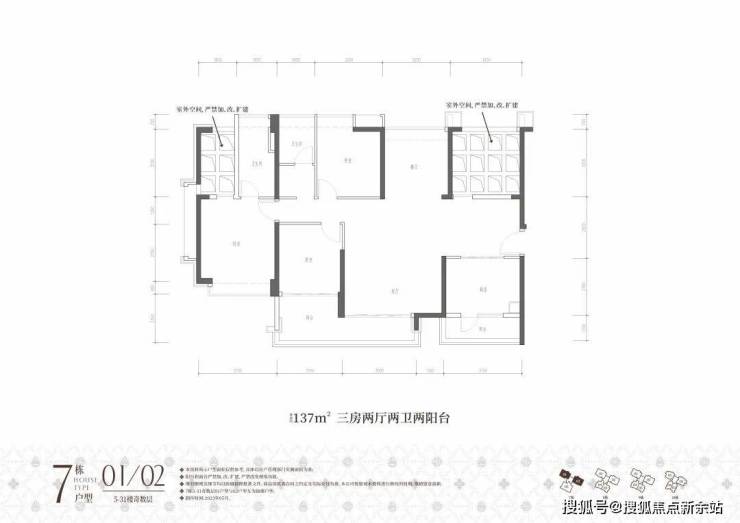 7栋01/02户,建面约137㎡,原始结构是三房两厅两卫两阳台或三阳台,奇数层客厅出阳台,厨房配有一个生活阳台,偶数层餐厅出阳台,主卧和厨房也都配有阳台。奇数偶数层入户玄关处都有一块镂空,搭起来可做房间,即使不搭它的整体户型结构、功能间配比及分布也比较合理。