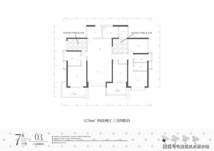 7栋03户,建面约176㎡,原始结构是四房两厅三卫四阳台,奇数层客厅、主卧、厨房都有阳台,偶数层是主卧、次卧、厨房有阳台。奇数偶数层入户门的阳台可做玄关使用,餐厅左侧镂空处搭起来可做卧室,餐厅右侧搭起来可做书房或儿童房使用,最多可做5+1房使用,可塑性非常强