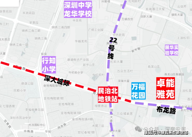 卓能雅苑,位于龙华区民治街道布龙路与油松路交界处,项目西侧是新房万福花园,北侧是嘉龙山庄,南侧是布龙路,周边居住氛围、商业氛围都特别浓厚,深大城际和22号线换乘站“民治北站”距离约500米。