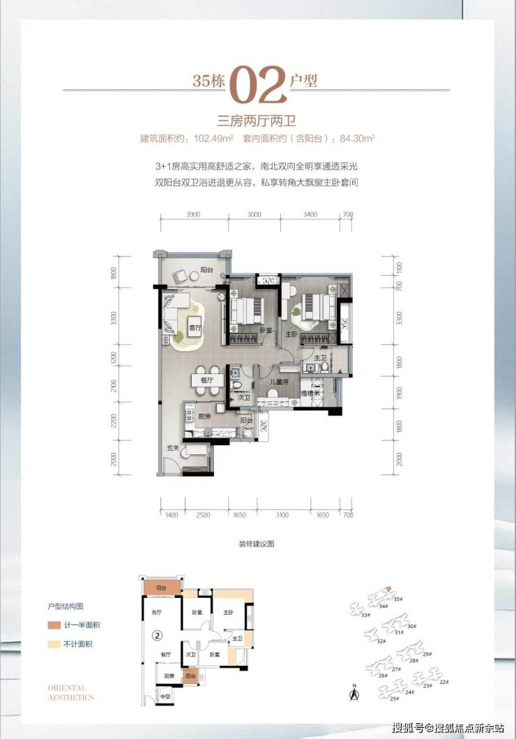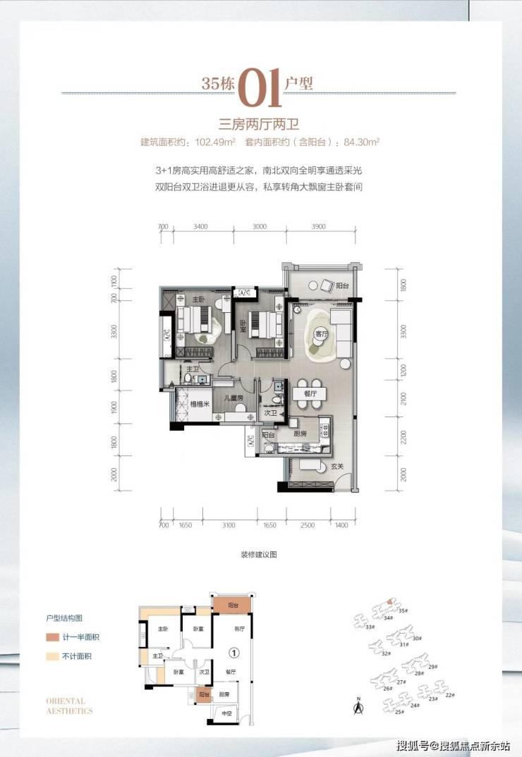 逸骏半岛三期35栋新品,建面约91-110㎡,以更小的建筑面积,巧思匠造,实现空间阔绰灵动变化、户户南向采光充沛的大三房、3+1房。