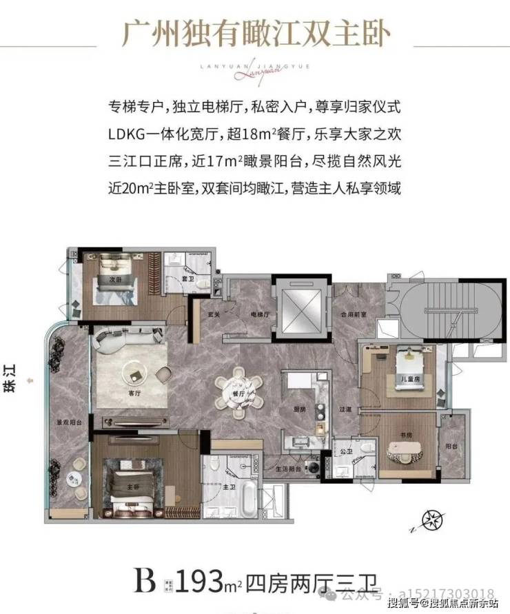 体量不大,项目只规划了一栋楼,18层高,全盘只有68套,而且只做了两种户型:193㎡和285㎡江景大平层。