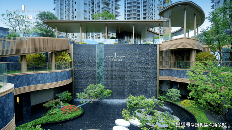 项目打造的近9米水庭院瀑布实景绽放。论形制、论规模,这处园林造景在前海乃至整个深圳都很罕见!