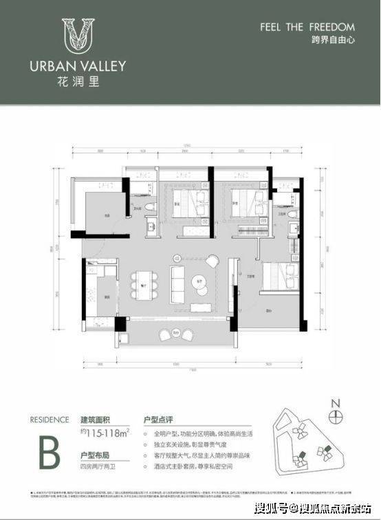115㎡-118㎡四房两厅两卫网易:横厅设计,户型方正,南北通透,客厅开间约 6.5 米,阳台面宽也约 6.5 米,视野开阔,采光充足。四房设计可满足三代同堂及成长型家庭需求,主卧采用酒店式套房设计,配备独立卫浴和衣帽间,私密性好。该户型能拥揽一线山景,提升居住舒适度。
