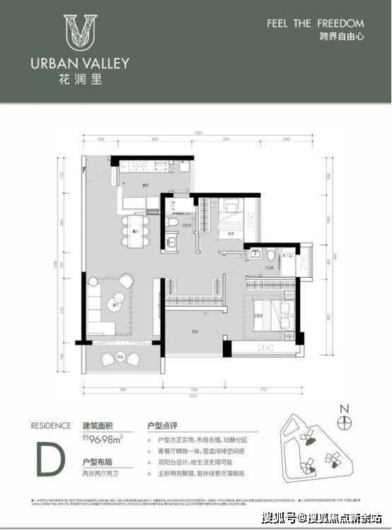 96㎡三房两厅两卫:户型方正,均为南向朝向,采光充足。客厅开间约 3.8 米,采用餐客厅一体化设计,连接双阳台,观景阳台宽阔,空间感和通透感好网易。U 型厨房设计,操作台面宽敞,分离式卫生间提高使用效率。