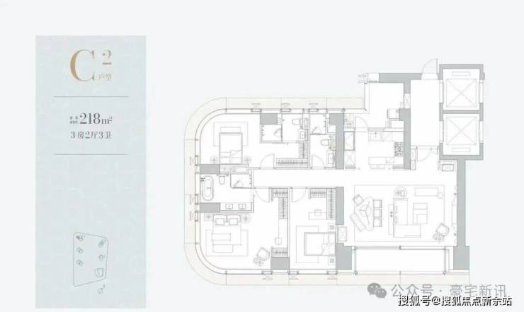 1C栋(1栋三单元)-51层:4梯3户,约210㎡,为一期的入门级户型,一层三户。