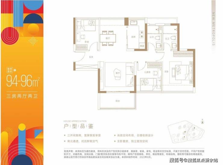 建面约94~96㎡三房两厅两卫