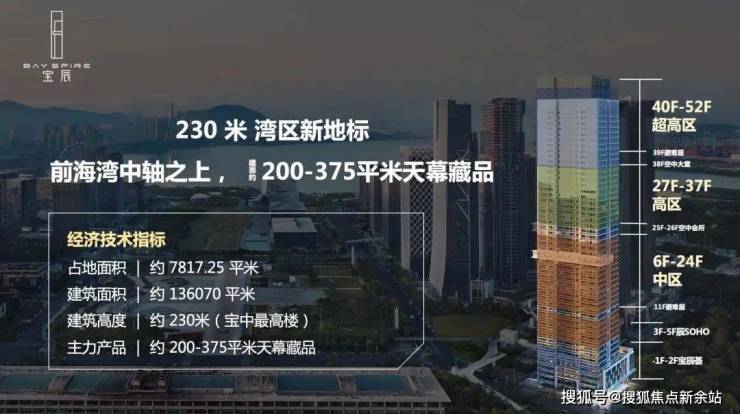 华侨城宝辰总高230米,为宝中最高楼;项目52层,分为中区、高区、超高区,6层起卖,11、39F为避难层,25-26F为空中会所,28F为空中大堂。除了空中大堂项目还有地下入库大堂+首层大堂,一共三重大堂。