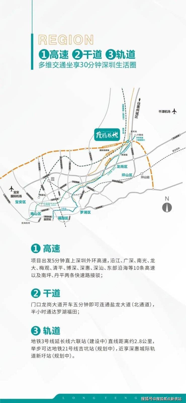 地铁3号线延长线六联站(建设中)直线距离约2.8公里,举步可达地铁21号线吉坑站(规划中),近享深惠城际轨道新圩站(规划中),出门即上深圳外环高速,龙岗大道、盐龙大道,实现深圳东部与市中心区乃至香港的快速出行。