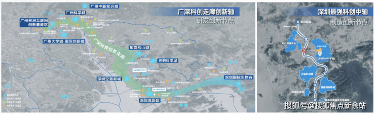 🏙双轴:广深科创走廊创新轴-研发创新节点和深圳最强科创中轴-制造创新节点,东起深圳国际生物谷,西至广州琶洲互联网创新集聚区、南联深圳科技园和后海商务区,北接松山湖,肩负共筑“创新脊梁”的重要使命