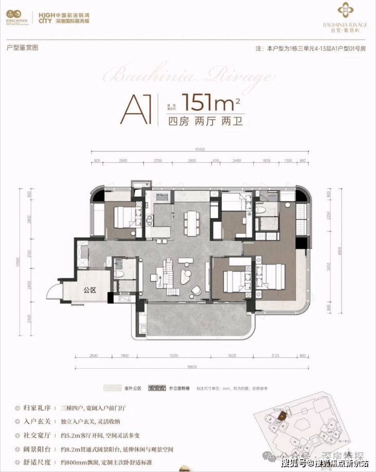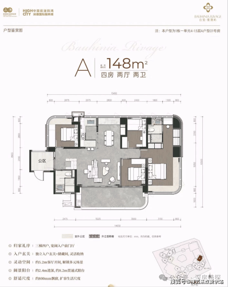湾啟紫荆府位于南山前海深港合作区妈湾15单元02街坊,港城路与航海路交汇处西南侧,地处前海深港合作区最为核心的区域,在2023年12月10日,国务院批复《前海深港现代服务业合作区总体发展规划》(简称《前海规划》),开启前海合作区开发开放新篇章。项目整体占地面积约2.9平方公里土地,几乎占据了前海妈湾片区的一半土地,规划7大单元板块,是集办公、居住、商业、酒店、文化娱乐配套设施于一体,建筑面积超500万㎡的恢弘体量。从位置上看,妈湾是唯一一个在三个湾区里面拥有270°视野,两面临海,容积率极低,未来有希望成为高端宜居生活住区。妈湾未来的配套规划,有沿滨海岸线建设金融博物馆、改革开放博物馆、国深博物馆、海洋博物馆、渔人码头、前海新中心地标等市政配套集群。