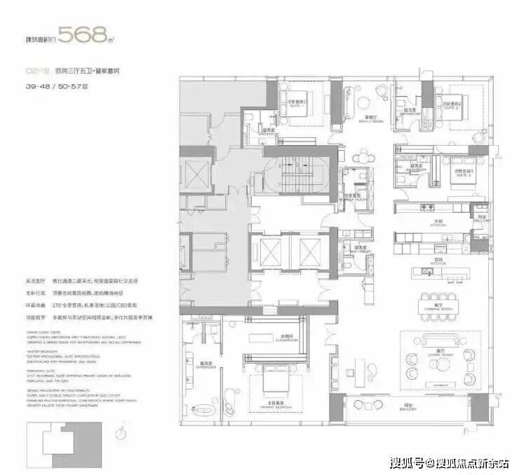 南北通透三面采光,顶奢总统套房规格,270°全景套房,享受湿地/公园/CBD景观,都是套房设计,更具私密性,中西厨分离。