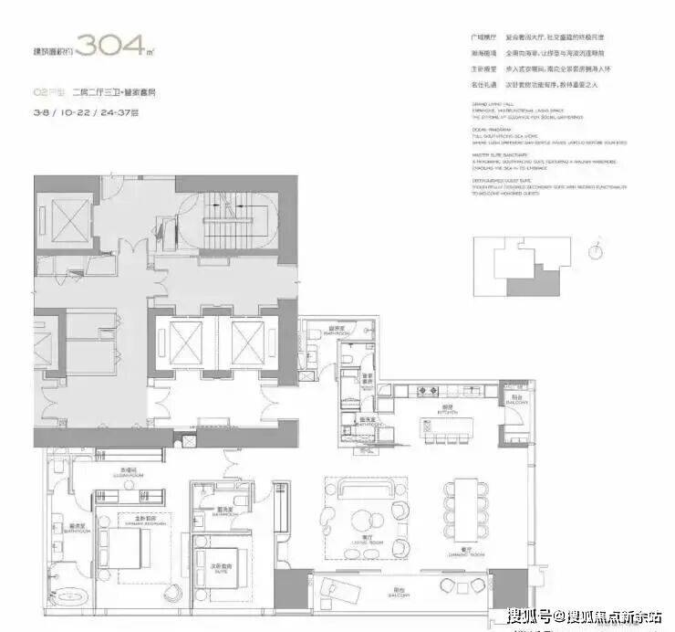 公寓主力户型为303㎡、326㎡、404㎡、572㎡等大平层,最大户型达1000㎡