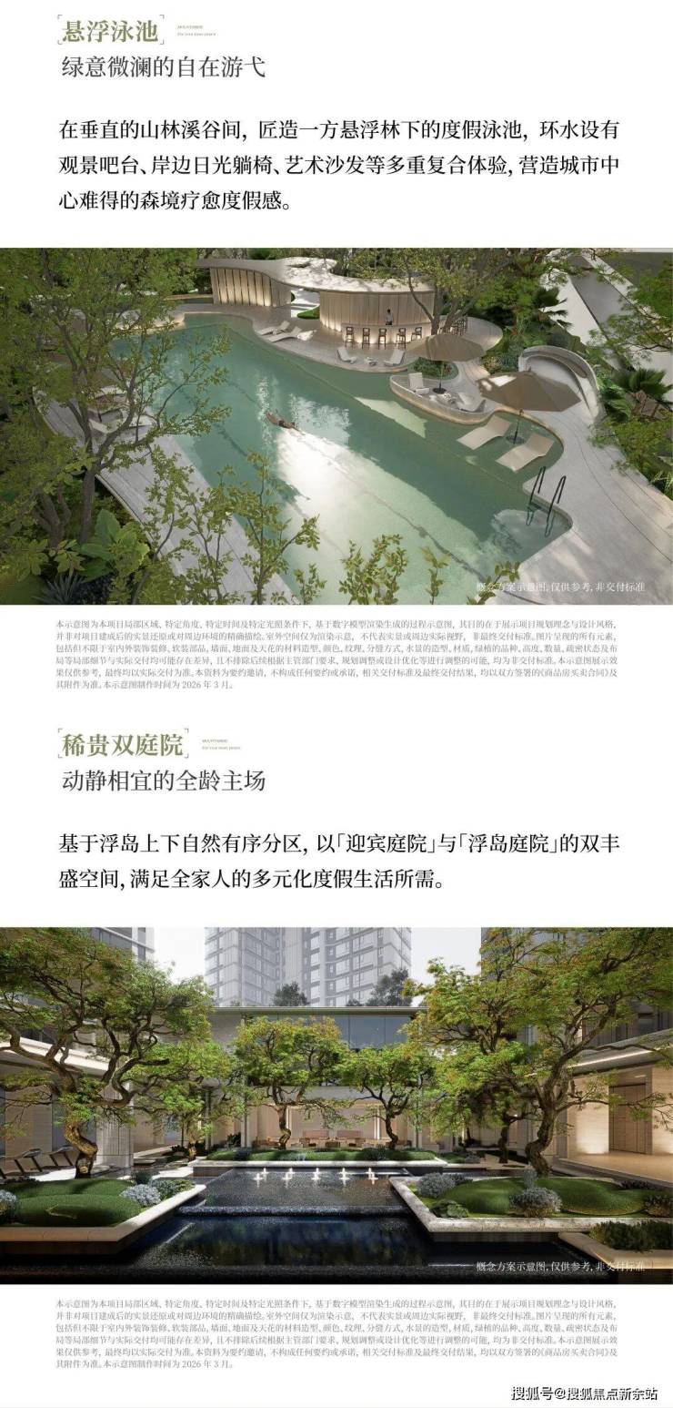 ·全龄社区配套:匠造一方悬浮林下的度假泳池,环水设有观景吧台、岸边日光躺椅、艺术沙发等多重复合体验,营造城市中心难得的森境疗愈度假感;同时以「迎宾庭院」与「浮岛庭院」的双丰盛空间,满足全家人的多元化度假生活所需。