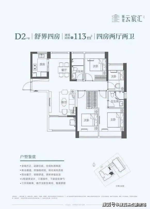 113㎡的4房2厅2卫,设计的竖厅南北通透格局,餐客厅一体化,U型厨房,阳台东南朝向。