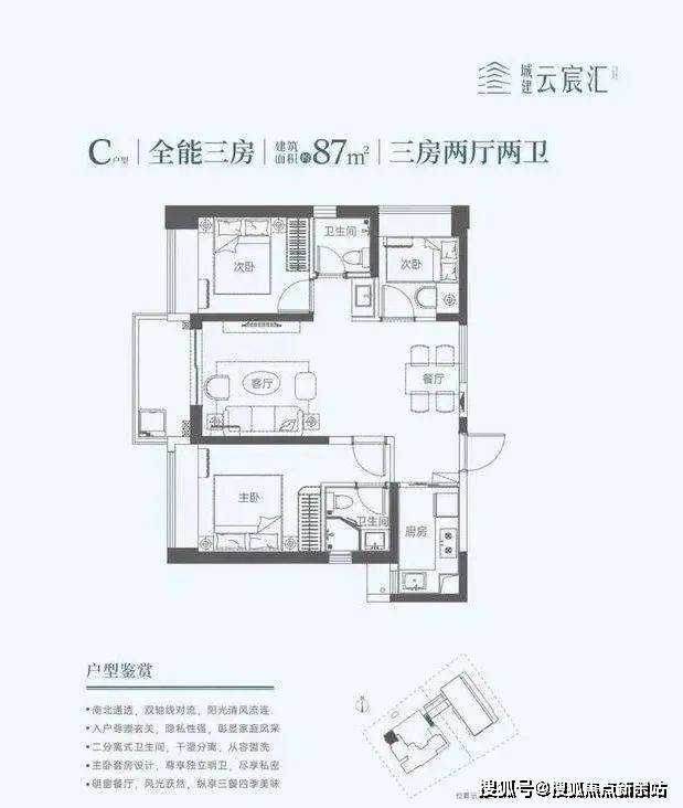 87㎡的3房2厅2卫,设计的双龙抱珠格局,餐客厅一体化,L型厨房,东南朝向。