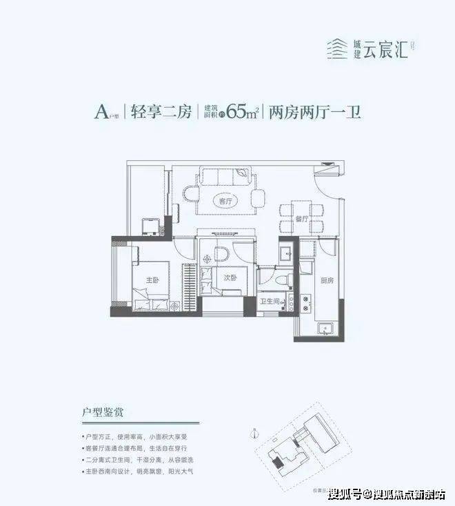 65㎡的2房2厅1卫,设计的竖厅格局,餐客厅一体化,L型厨房,西南朝向。