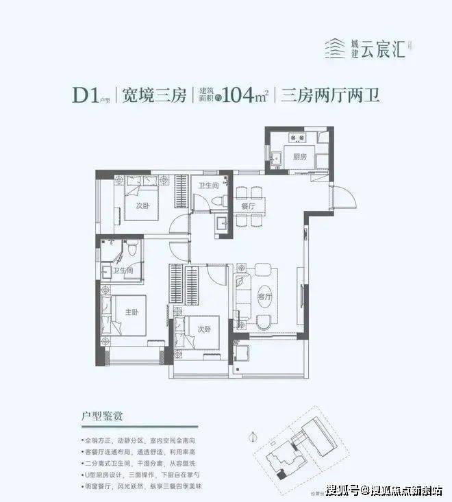 104㎡的3房2厅2卫,设计的竖厅南北通透格局,餐客厅一体化,U型厨房,阳台西南朝向。