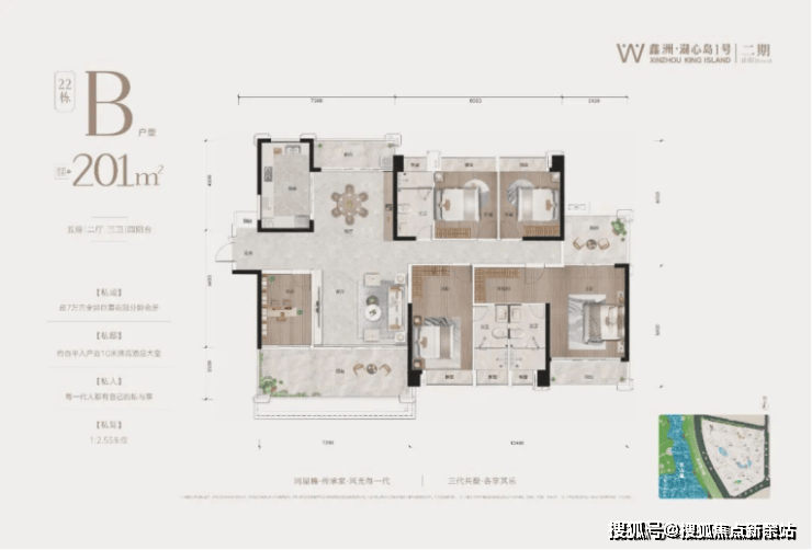 22栋B户型:建面约201㎡,5房2厅3卫