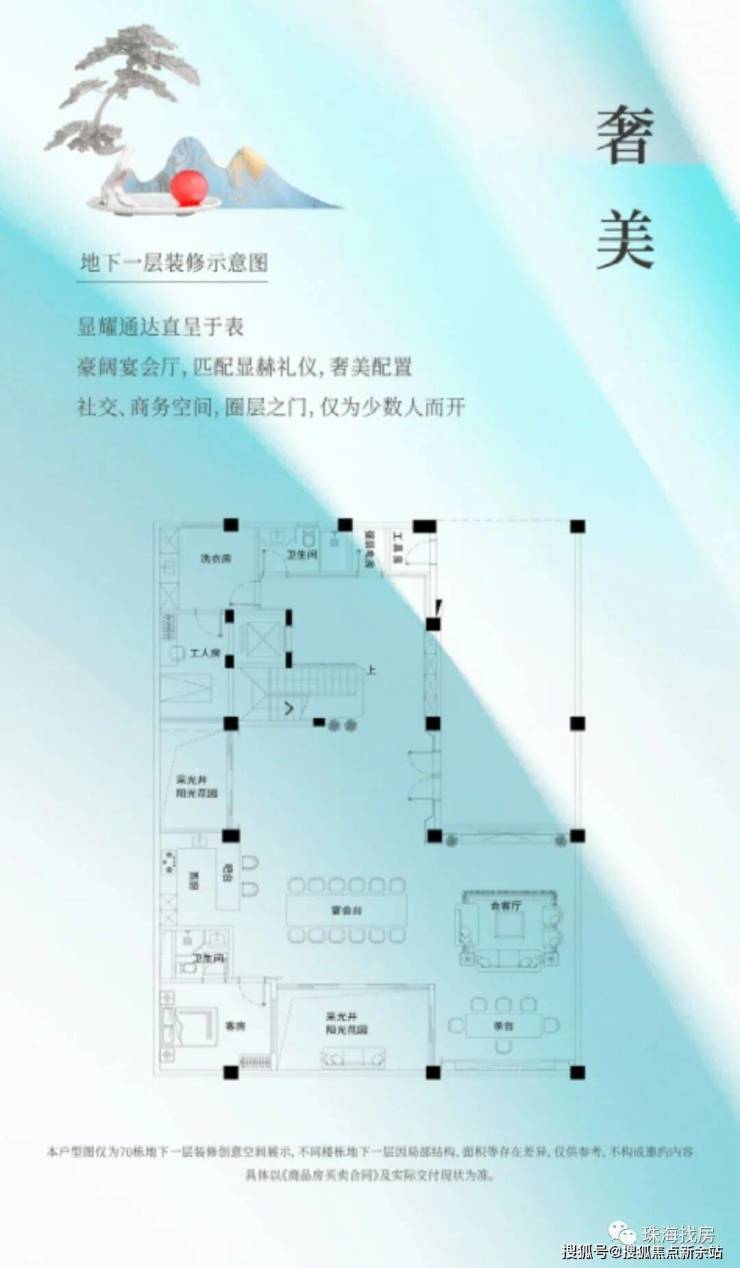 依地势抬高,地下一层相当于地面首层,阶梯相接的天井设计,负一层采光全明,形成稀缺的阳光双首层格局,避免潮湿与漏水,保护尊驾与收藏品。