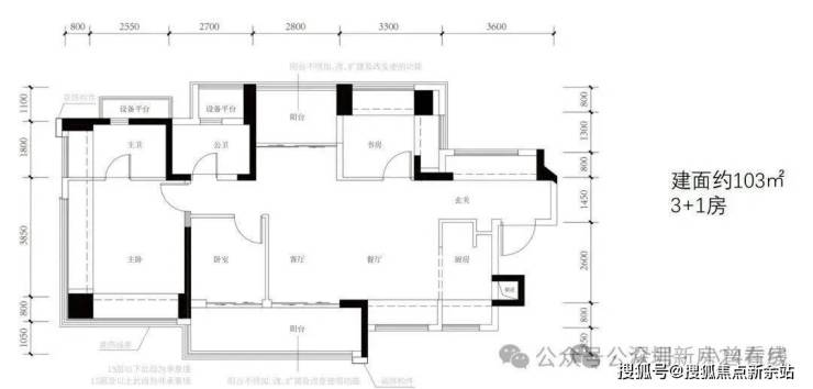 这个户型位于端头位置,独门独户,还在户型外围做了一圈不计面积的飘窗、设备平台,综合使用率最高约103%。