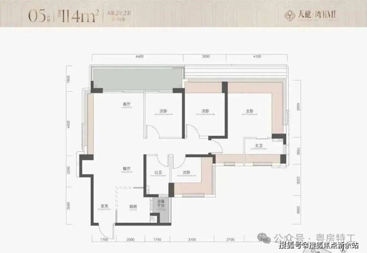 114㎡4房2卫,竖厅户型,朝北对着金众,户型结构和113完全一样,就是客厅也做了一面4.5米宽的凸窗;