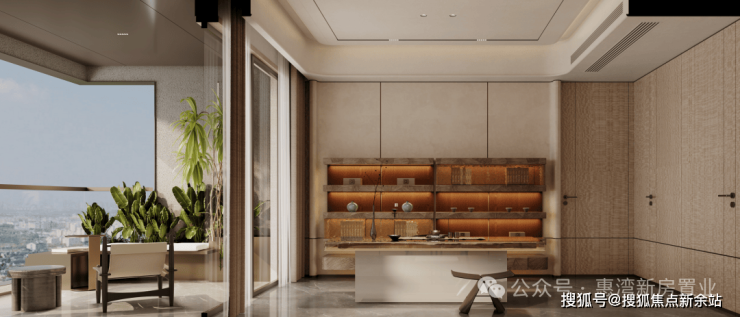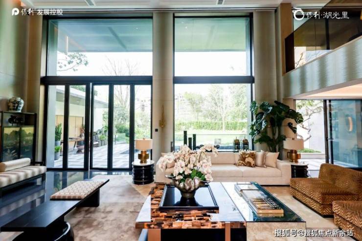 进入到室内,便能看见这样一个画面,大面积的落地玻璃,约6米高的空间挑空。