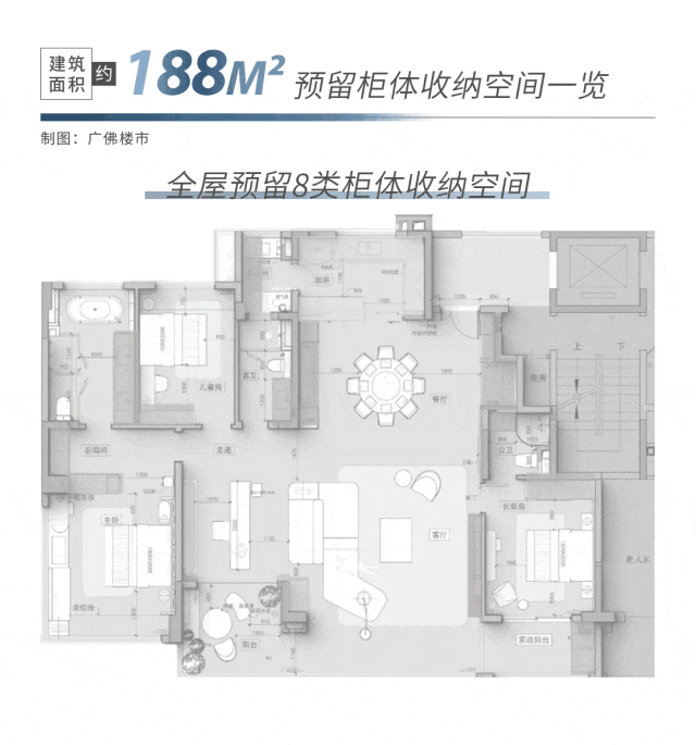 全屋预留8类柜体,带来比旧社区多1.5倍的超大收纳空间,完美解决高端家庭的储物需求,让生活井然有序。