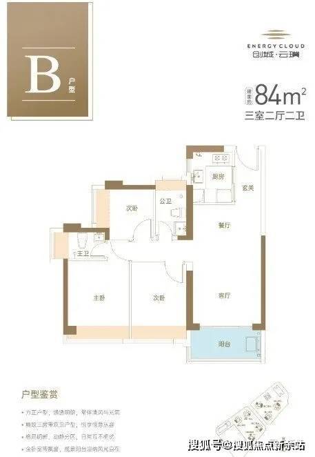84㎡的3房2厅2卫,设计的是竖厅格局,进门入户玄关,客厅3.4米开间,LDKB一体化设计,动静分区,3个卧室分别做到了主卧10.45㎡/次卧8.76㎡/次卧5.39㎡(实测面积,去掉墙体),U型厨房,卫生间干湿分离,得房率约74.4%(不含赠送),套内面积62.4m²,西北、东北、东南或西南朝向。