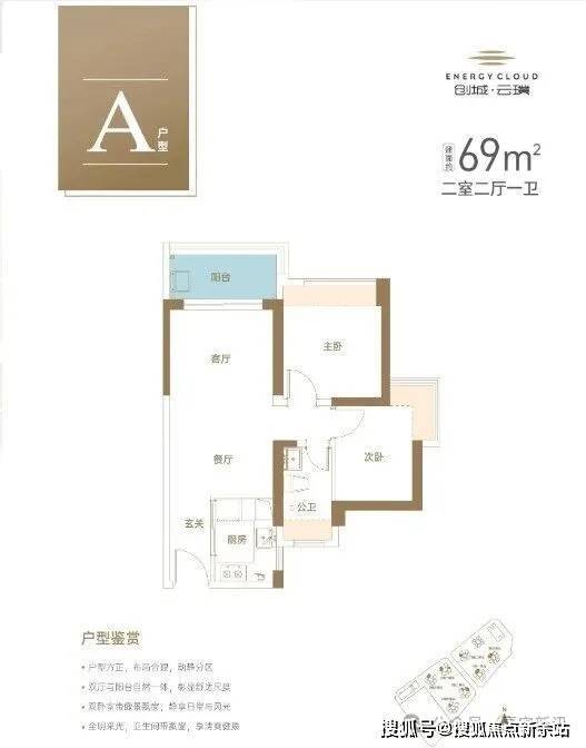 69㎡的2房2厅1卫,设计的是竖厅格局,客厅3.3米开间,LDKB一体化设计,2个卧室分别做到了主卧9.76㎡/次卧7.77㎡(实测面积,去掉墙体),U型厨房,卫生间干湿分离,得房率约74.4%(不含赠送),套内面积51.04m²,西北/东北或东南朝向。