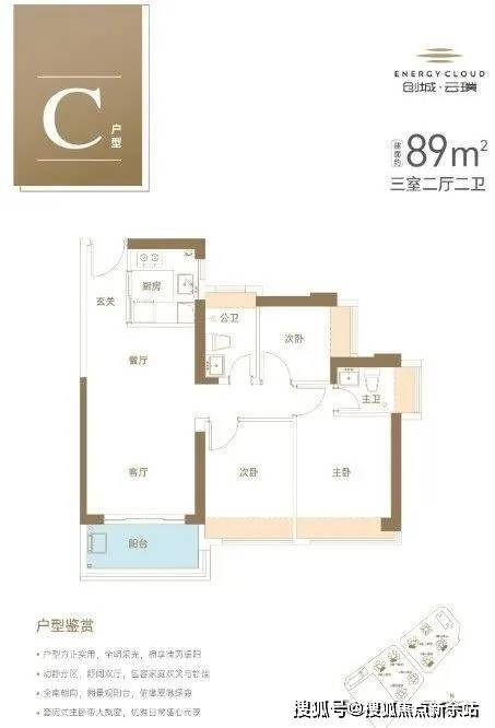 89㎡的3房2厅2卫,设计的是经典竖厅格局,进门入户玄关,客厅3.5米开间,LDKB一体化设计,三开间朝南,动静分区,3个卧室分别做到了主卧11.23㎡/次卧9.1㎡/次卧5.64㎡(实测面积,去掉墙体),U型厨房,卫生间干湿分离,得房率约73.29-73.86%(不含赠送),西南或东南朝向。