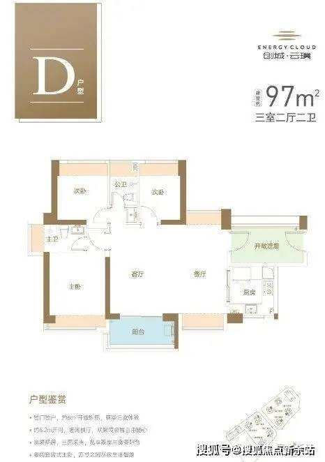 97㎡的3房2厅2卫,设计的是横厅南北通透格局,进门送7㎡超大入户玄关,客餐厅6.2米开间,LDKB一体化设计,四开间朝南,3个卧室分别做到了主卧12.24㎡/次卧8.38㎡/次卧6.41㎡(实测面积,去掉墙体),U型厨房,公卫三段式分离,得房率约73.29-73.86%(不含赠送),阳台主朝东南向。
