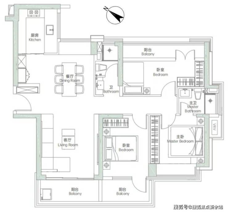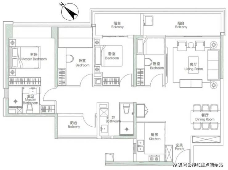 低区03户型,122-124㎡,常规三房两卫格局,三开间朝西南,一卧室朝东南,三阳台是亮点: