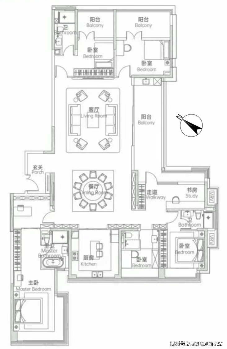高区01户型,144-145㎡,朝东北,四房两卫,五房需将阳台改房间,改后该房间采光不好: