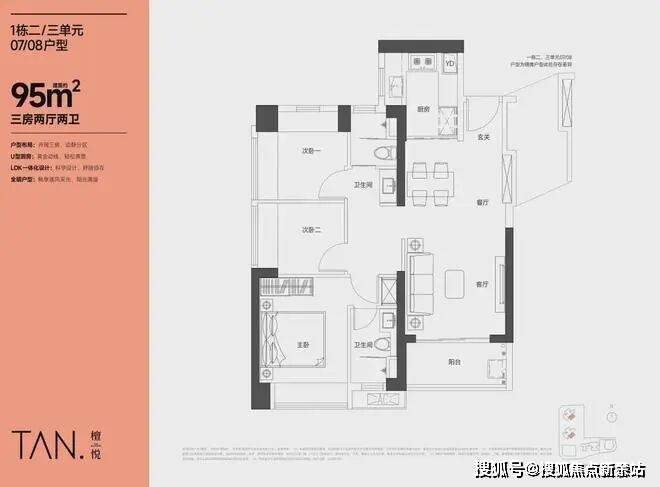 95㎡的3房2厅2卫,设计的是竖厅格局,LKDB一体化设计,进门入户玄关,有1个次卧做的双飘窗,U型厨房,卫生间三段式分离,得房率:74.34%(不含赠送),全部东南朝向。