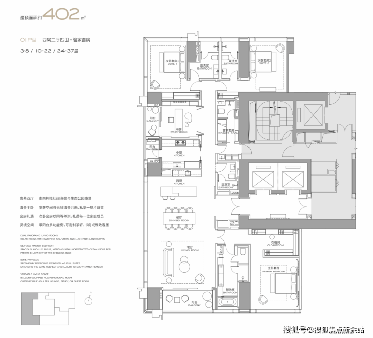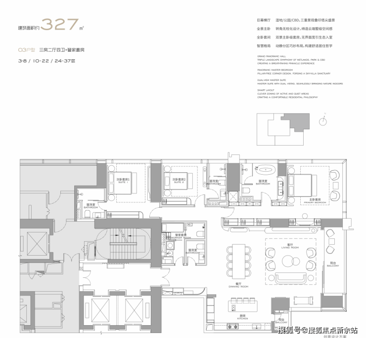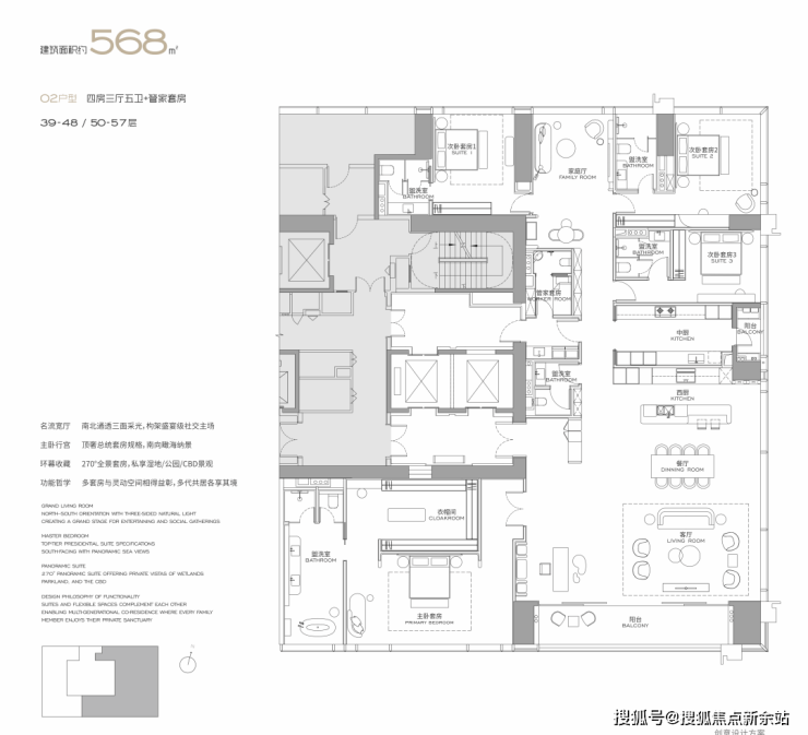产品主打303-1032㎡总裁大平层,层高3.6-3.9 米,户户朝南,配6.8 米宽景阳台、270° 环幕飘窗,通燃气、带独立家政间。主力户型:303㎡2+1 房 3 卫、327㎡3+1 房 4 卫、402㎡4+1 房 4 卫,高区至 1032㎡顶复,全奢装交付,由 Yabu、Kelly Hoppen 等国际大师设计,标配 Gessi 等国际品牌。